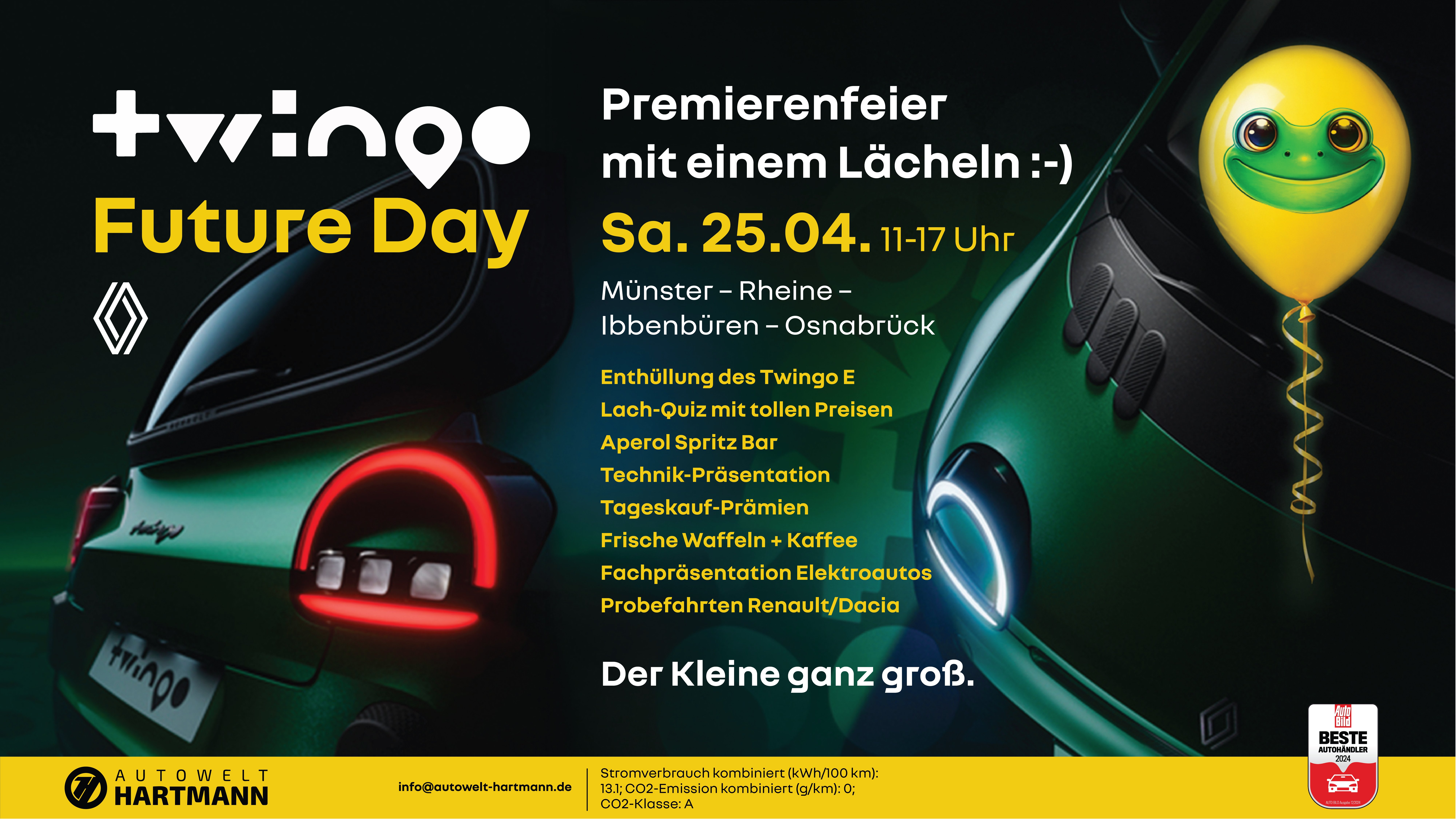 Preis ab 24.330 € inkl. 1.090 € Überführungskosten RENAULT Twingo E-Tech elektrisch Techno 80hp Urban Range Stromverbrauch kombiniert (kWh/100 km): 13.6; CO2-Emission kombiniert (g/km): 0; CO2-Klasse: AMehr entdecken